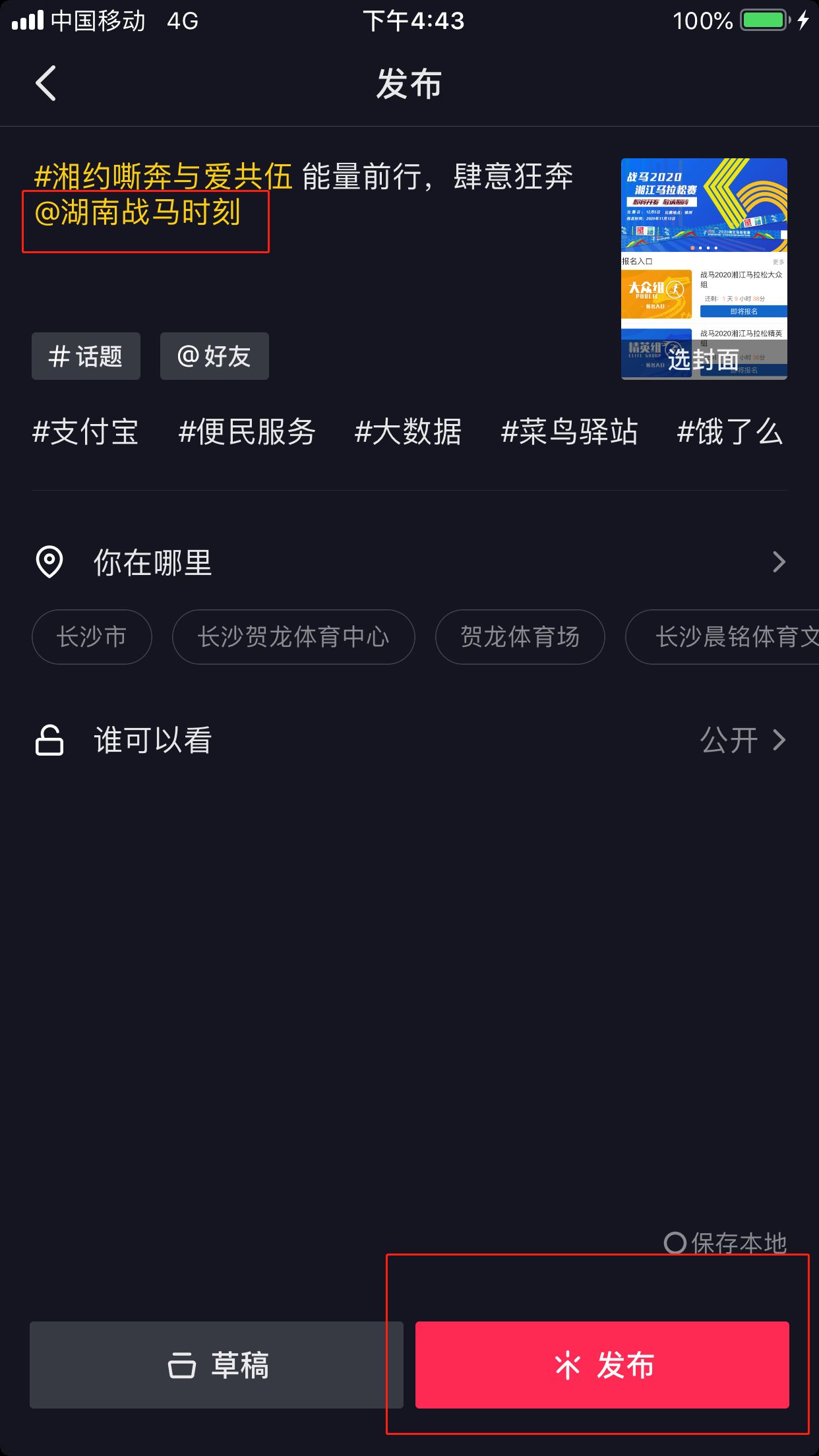 第三步:添加話題#湘約嘶奔與愛共伍,并@湖南戰馬時刻,點擊發布即可。