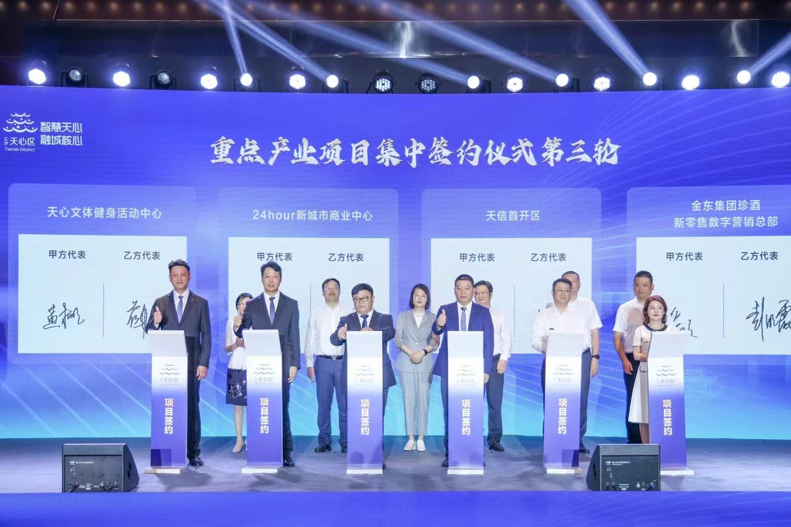會場上,湘商代表共聚一堂,“招商顧問”紛紛上臺,推介天心、宣傳天心;“四新經(jīng)濟(jì)示范企業(yè)”授牌,12個重點招商項目簽約,總投資額近100億元,其中包括天心文投與我司共同布局區(qū)域體育消費新賽道—天心區(qū)文體活動中心項目。
